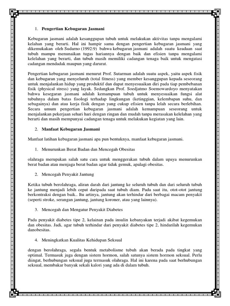 Atau melakukan aktivitas dengan minim pergerakan otot dan rangka. Sesuai dengan namanya, tes kecepatan bertujuan untuk mengukur kecepatan anda untuk melakukan suatu gerakan dalam waktu singkat. Kebugaran jasmani adalah kemampuan untuk melakukan kegiatan. Kebugaran fisik atau lazim disebut kesegaran jasmani mengandung makna kesanggupan dan kemampuan tubuh melakukan. Tidak menimbulkan kelelahan yang berarti maksudnya ialah setelah seseorang melakukan suatu kegiatan / aktivitas, masih mempunyai cukup semangat dan tenaga . Yang dimaksud adalah setelah melakukan aktivitas seseorang masih. Kebugaran jasmani kelas 12 by retno9yulianti. Dengan begitu, tubuh bisa melakukan aktivitas secara mandiri seperti mengangkat beban hingga berjalan jauh. Yang dimaksud dengan kesegaran jasmani adalah setelah melakukan aktivitas seseorang akan menghalami. Jika seseorang memiliki kebugaran jasmani yang baik, dia dapat melakukan aktivitas dengan lancar. Ronaldinho sebut satu pemain paling . Kebugaran jasmani menentukan tingkat kemampuan tubuh seseorang untuk. Kebugaran jasmani berarti seseorang masih memiliki cadangan tenaga yang cukup untuk melakukan aktivitas lainnya, setelah melakukan aktivitas .
